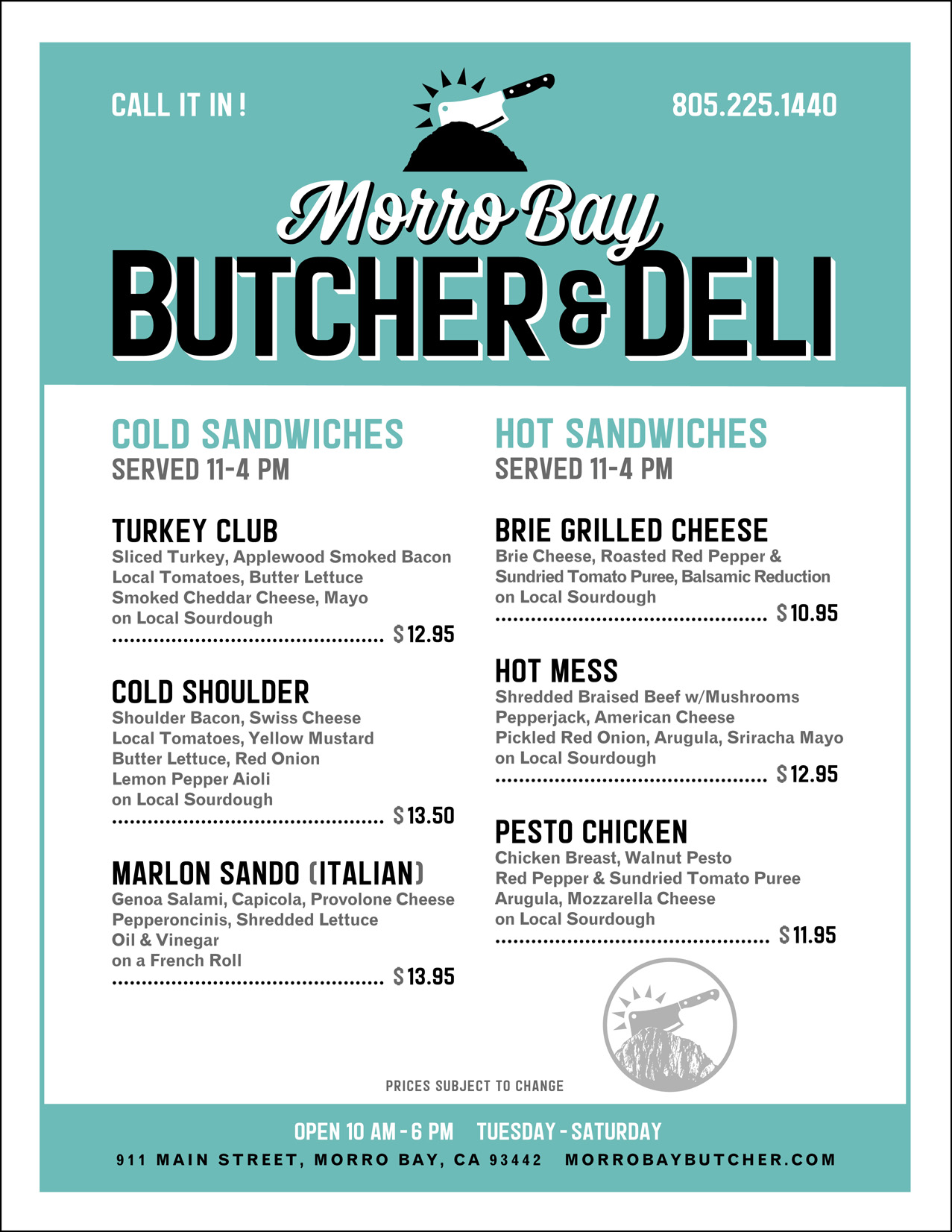 Morro Bay Butcher & Deli is the go-to source for quality meats, delicious sandwiches, specialty foods and smiles on California’s Central Coast. We are a group of young entrepreneurs who aim to be a part of the resurgence of consciously sourced, quality, local, meats to the marketplace, something that has been lost in this age of the supermarket and big box stores.